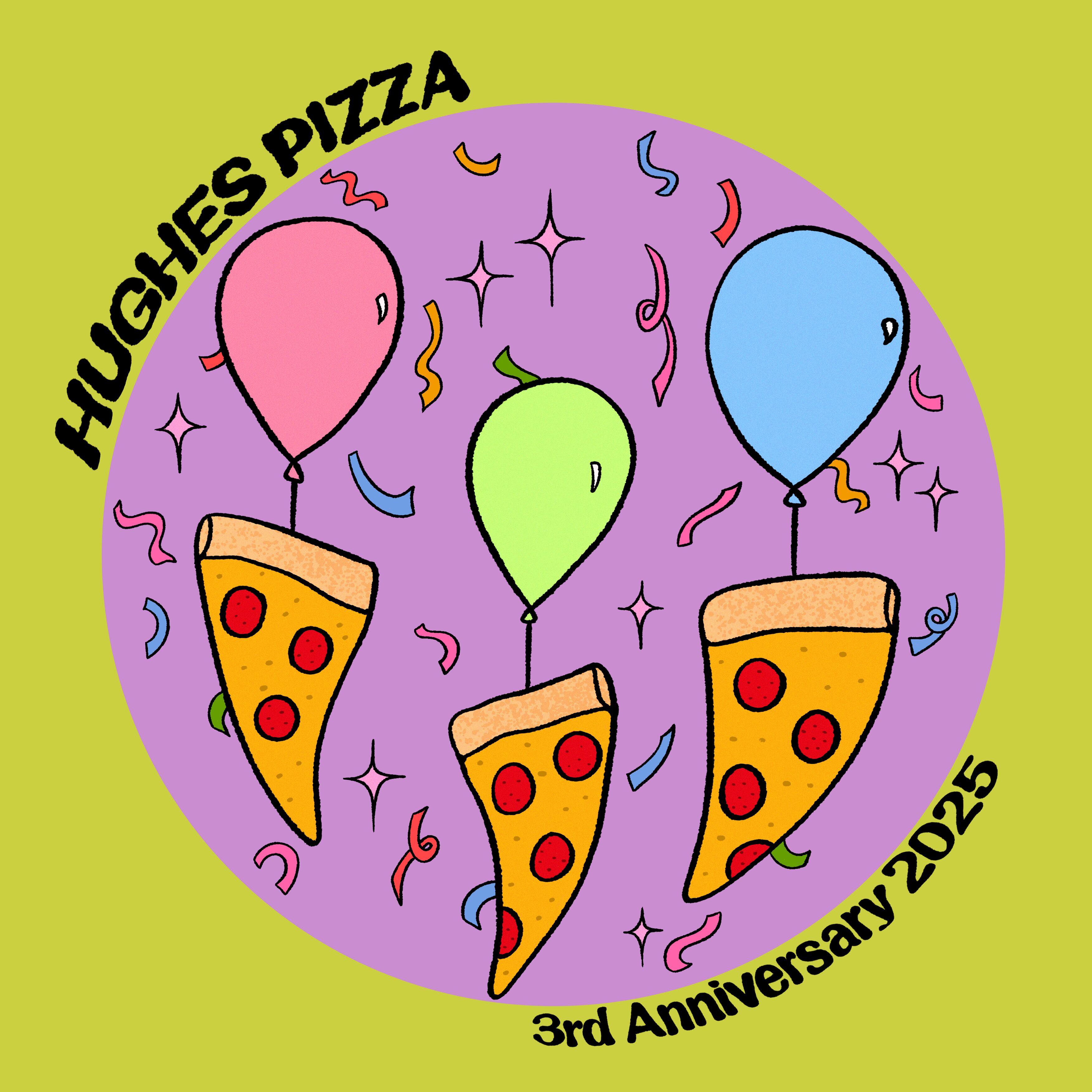 Osaka's best pizza shop serving NY style slices in Nakazakicho. A long time collaborator, I have created shop anniversary stickers, event flyers, menus, and more.大阪中崎町にあるのベストなピザ屋さん、ヒューズピザ。ずっと仕事をさしてもらっています。何周年のスティかー、イベントのフラヤー、メニューなど作っていただきました。